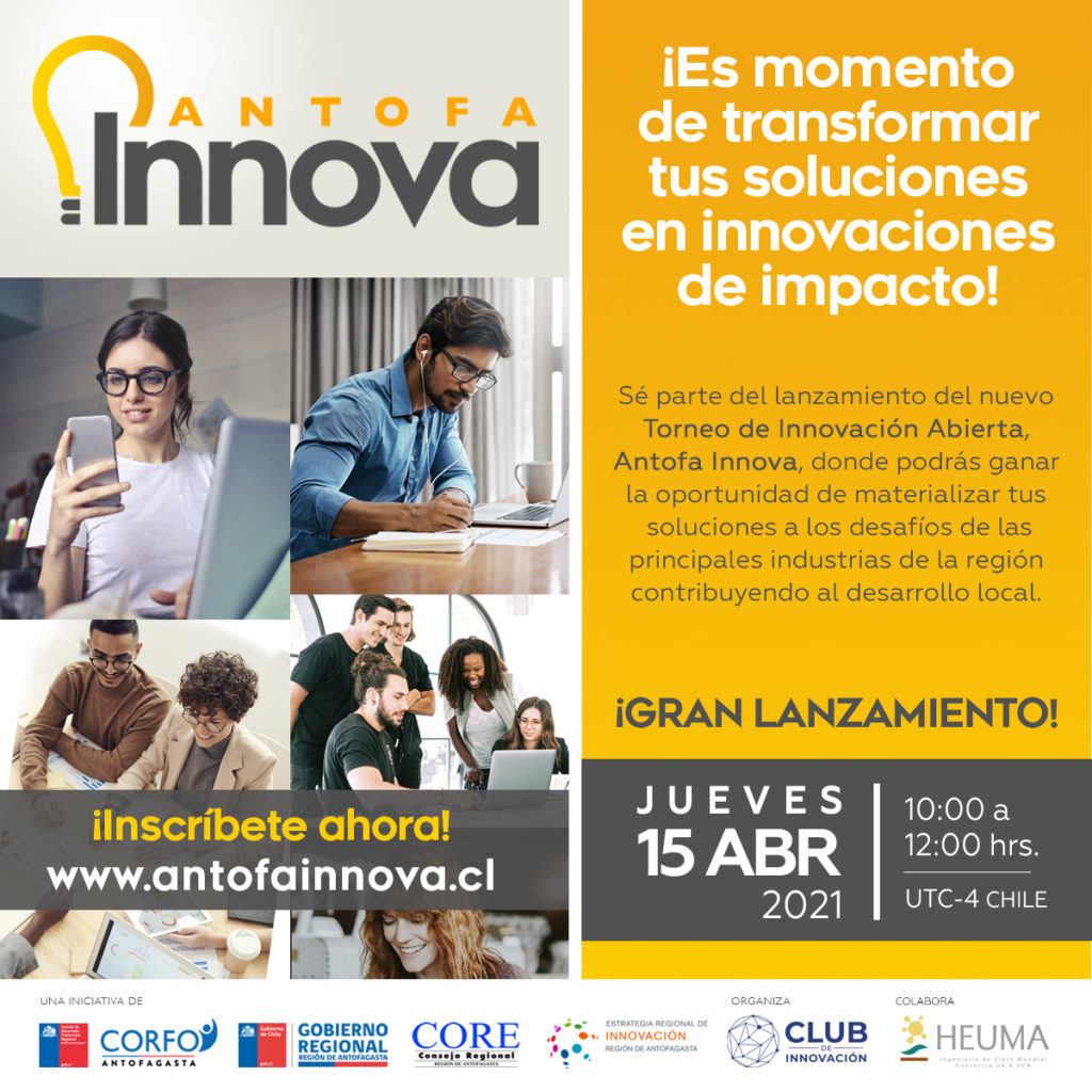 Te invitamos al gran lanzamiento del Torneo de Innovación Abierta Antofa Innova, una iniciativa del Comité de Desarrollo Productivo Regional de Antofagasta desarrollada por el Club de Innovación, que busca potenciar y promover el desarrollo de innovaciones tecnológicas para las principales industrias de la región de Antofagasta como son Minería, Energía, Logística, Turismo y Agricultura; mediante 3 torneos de innovación abierta.