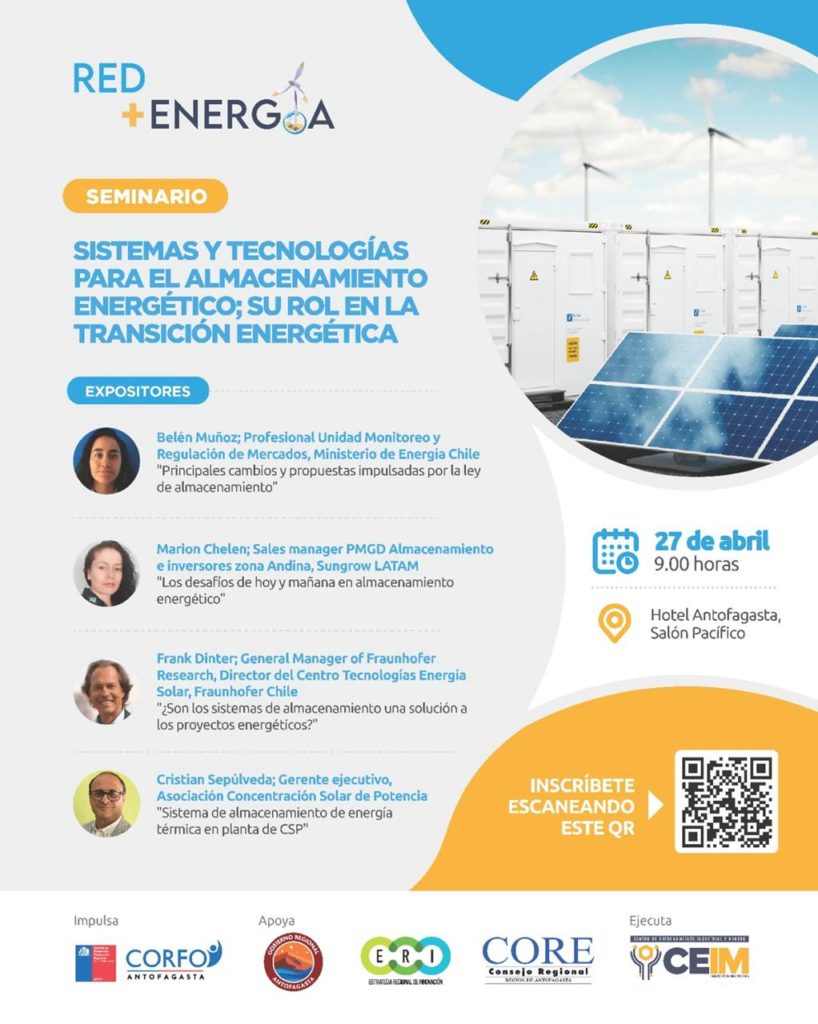 Invitamos a todos los Proveedores, Emprendedores, Profesionales y Futuros profesionales del sector energético de la Región de Antofagasta a participar del 3er Seminario “Sistemas y Tecnologías para el Almacenamiento Energético” , con la participación de destacados exponentes: