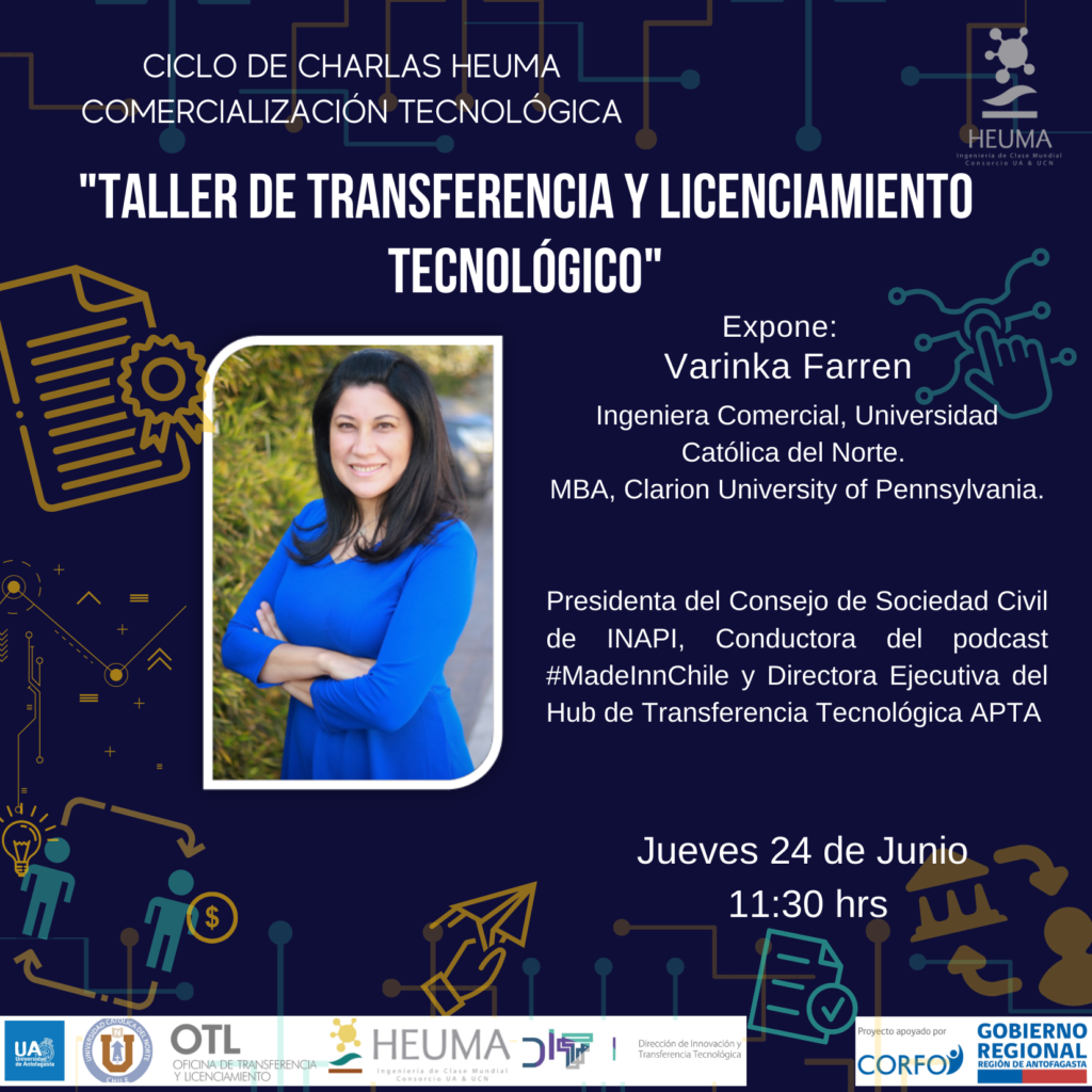 Expone Varinka Farren, Presidenta del Consejo de Sociedad Civil de Inapi, Conductora del podcast #MadeInnChile y Directora Ejecutiva del Hub de Transferencia Tencológica APTA