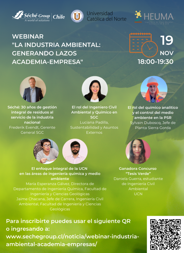 La Universidad Católica del Norte (UCN) y Séché Group Chile, con el apoyo de HEUMA, tiene el agrado de invitarlos al webinar “La industria ambiental: Generando lazos academia-empresa”, que se realizará el jueves 19 de noviembre, entre 18:00 y 19:30 vía Zoom.